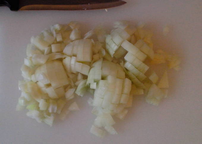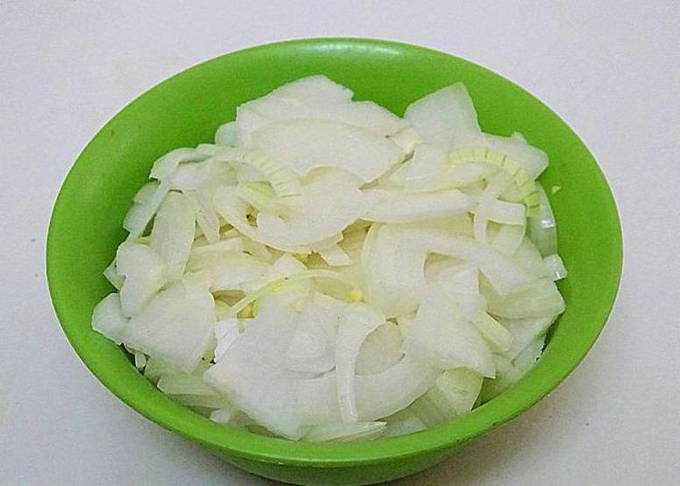 - Schil en spoel de uien. Snijd hem doormidden en vervolgens in halve ringen.