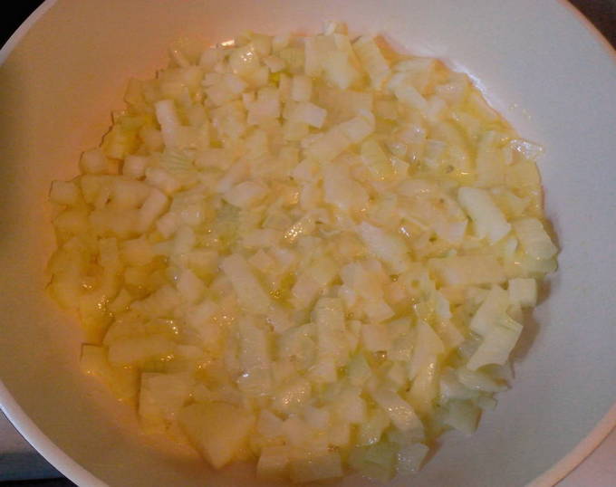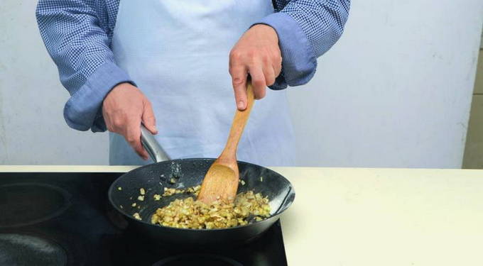 - Verwarm een koekenpan voor, zet het vuur lager en voeg boter toe (een stuk ter grootte van een walnoot). Als de olie in de pan is verdeeld, voeg je de ui toe en bak je deze glazig. Roer af en toe.