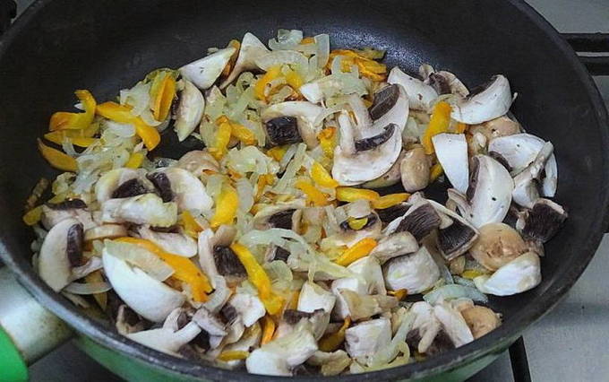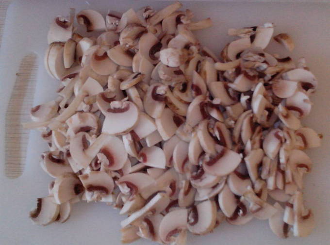 - We maken de champignons schoon (verwijder indien nodig de schil van de doppen), spoelen en snijden in kleine stukjes.