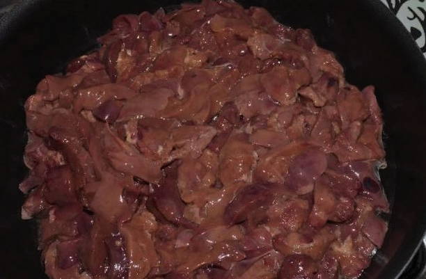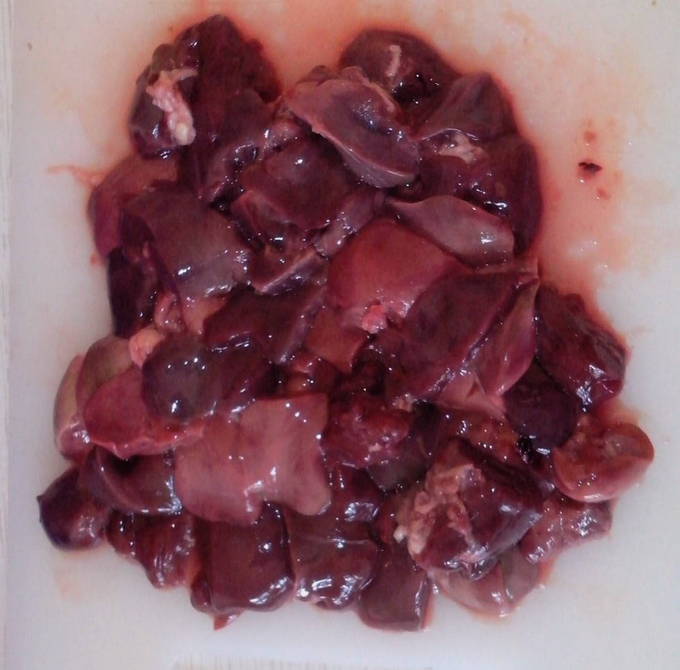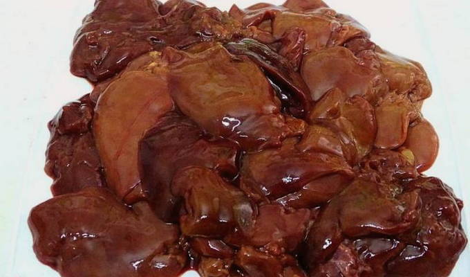 - We wassen de lever, drogen hem. Daarna snijden we in 2-3 stukken, waarbij we eraan denken de vetlagen te verwijderen.