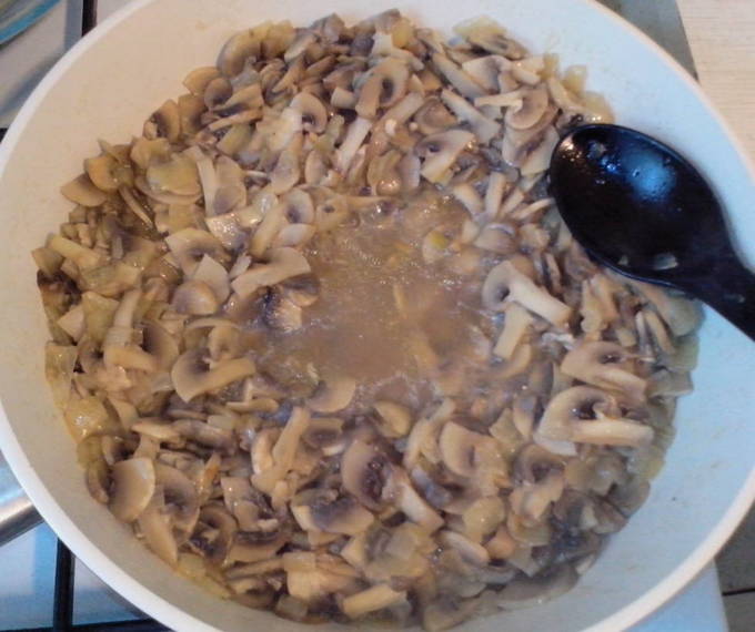 - We sturen de gehakte champignons naar de pan naar de ui, verhogen het vuur en bedekken onmiddellijk met een deksel. Tijdens de warmtebehandeling geven champignons veel sap af, in dit recept hebben we het nodig voor de saus. Daarom laten we het dankzij het deksel niet verdampen.