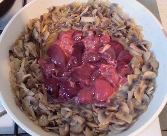 - Terwijl je de lever maakte, werden de uien en champignons gestoofd en kregen ze de juiste hoeveelheid sap. Verwijder het deksel, schuif de champignons en uien naar de randen van de pan, zodat het midden vrij is voor de lever.