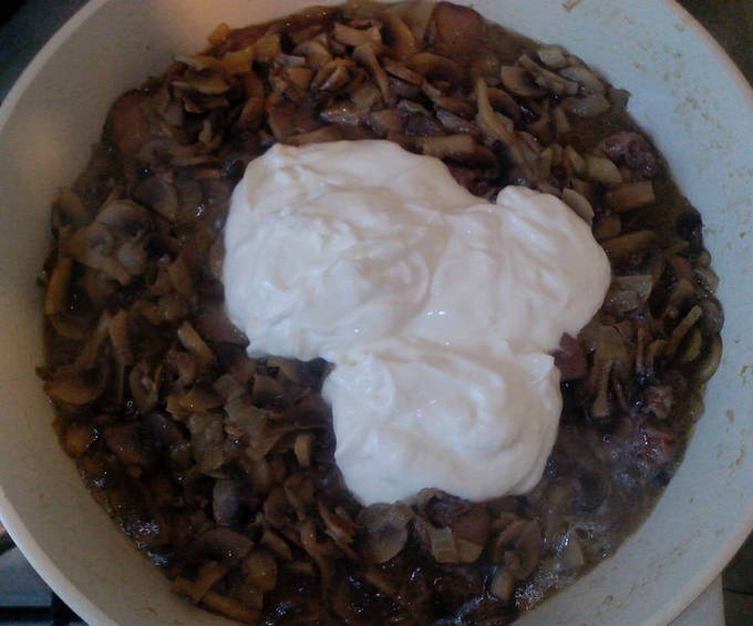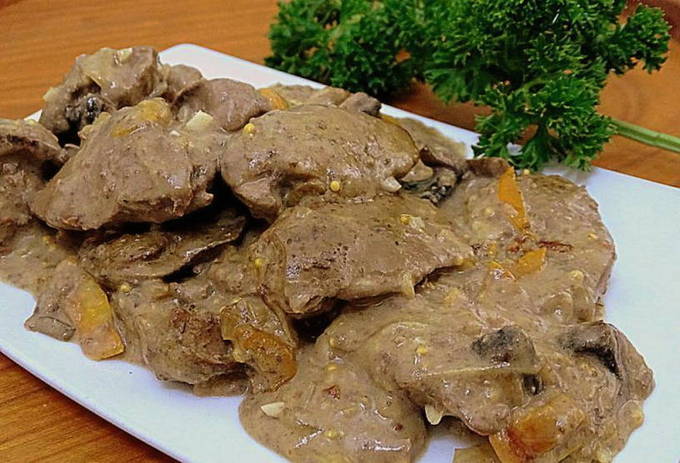 - Een eenvoudig en lekker recept voor kippenlever in zure room met uien en champignons