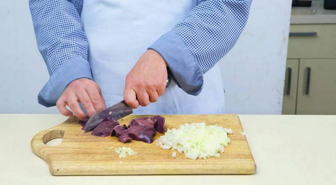 - Zorg goed voor je lever. Als je diepvrieslever gebruikt, moet deze vooraf in natuurlijke omstandigheden (bij voorkeur in de koelkast) worden ontdooid. Spoel het af, laat het uitlekken in een vergiet. Snijd in stukjes en denk eraan de vetlagen te verwijderen.