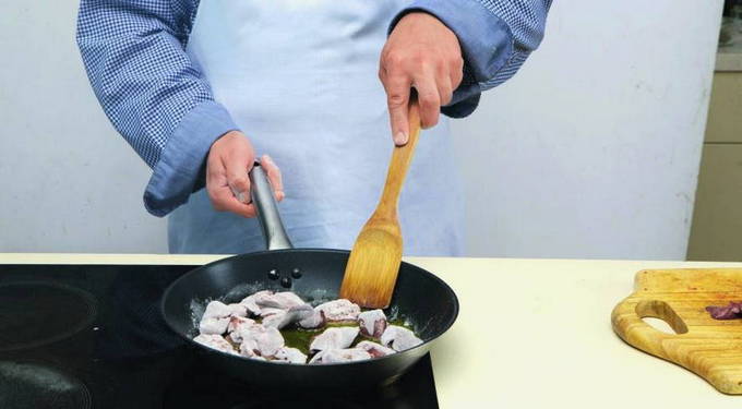 - Giet plantaardige olie in een braadpan, verwarm en breng de lever erin.