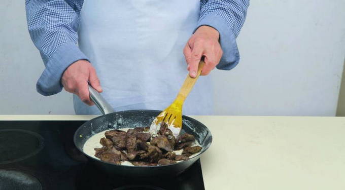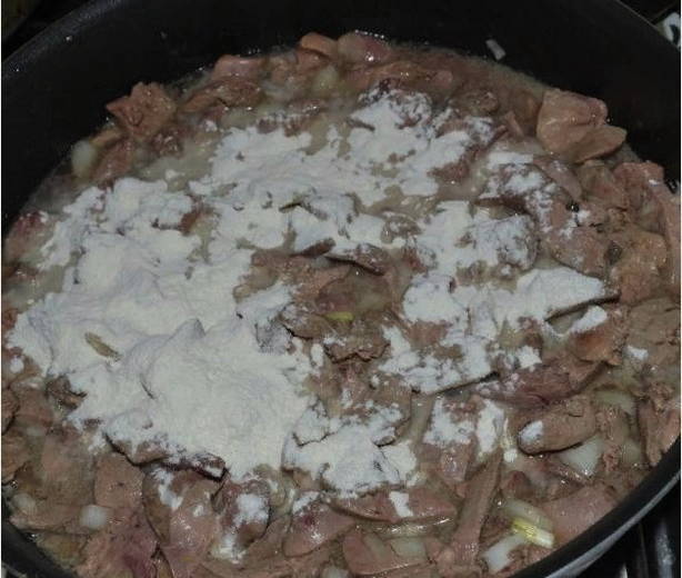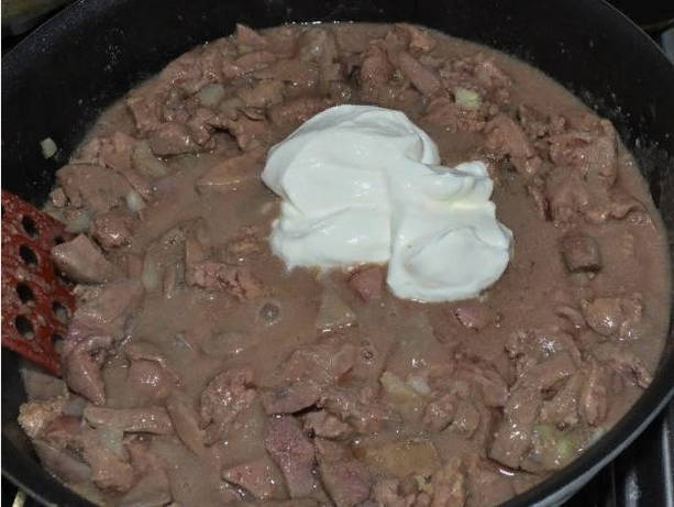 - Wanneer de hele lever gebakken is, stuur je de uien naar de pan (als er geen olie meer is na het bakken van de lever, voeg dan een beetje toe aan de pan). Bak 5 minuten op middelhoog vuur en voeg dan de knoflook en bloem toe met kruiden die over zijn nadat de lever is gerold (het is voldoende om 2 eetlepels bloem toe te voegen). Kook 4 minuten, af en toe roeren. Het is tijd voor zure room. Doe het in een pan met de knoflook en ui. Roer om de zure room op te lossen.