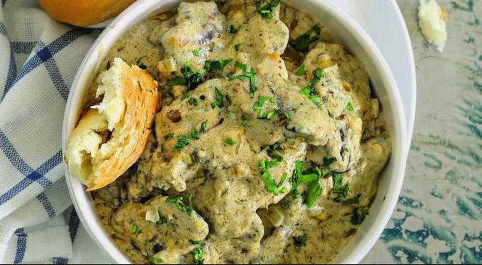 Kippenlever, gekookt in combinatie met zure room, uien en knoflook, blijkt erg aromatisch te zijn. Ze kan gerust als volwaardig gerecht dienen. Ik raad je aan om lekker brood of een stokbrood in te slaan, want je weekt de saus van de lever tot de laatste druppel.