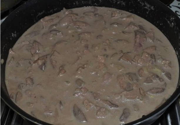 - Malse kippenlever in een jus van bloem, zure room en uien