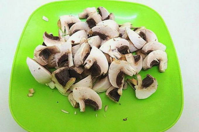 - Terwijl de uien sauteren, bereidt u de champignons voor. Als de champignonhoeden groot zijn, is het raadzaam om ze te schillen, vervolgens af te spoelen en in stukjes te snijden.