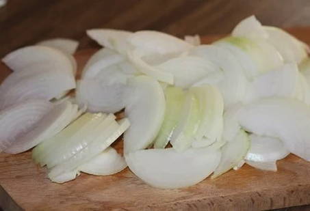 - We maken de ui schoon, spoelen hem af. Snijd elke ui in 4 stukken en vervolgens in ringen.