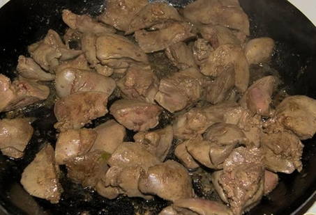 Schep de gebakken uien uit de pan op een apart bord en bak de stukjes kippenlever in de pan. Na verloop van tijd duurt het ongeveer 5 minuten.