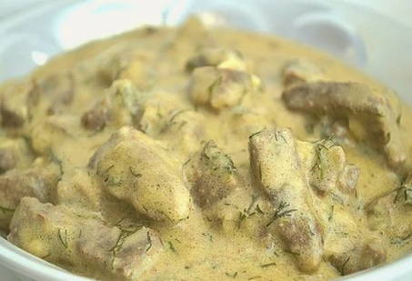 - Serveer de gekookte lever in zure roomsaus met knoflook en uien in een diep bord, spaar de saus niet. Bestrooi eventueel met verse kruiden (vergeet niet om ze eerst te wassen).