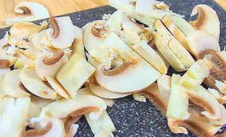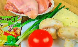 - Wij bereiden producten: champignons, tomaten en gevogelte afspoelen met water en drogen. Snijd het vlees in porties en klop het lichtjes met een keukenhamer, probeer de malse filet niet te scheuren.