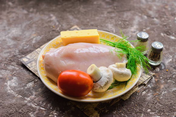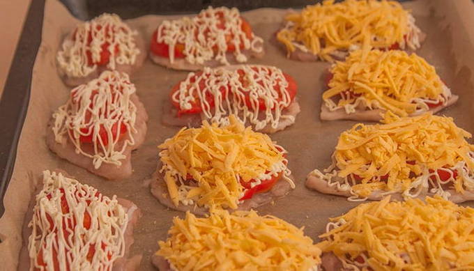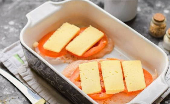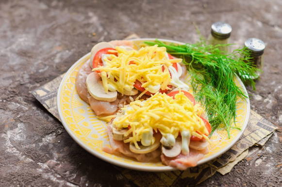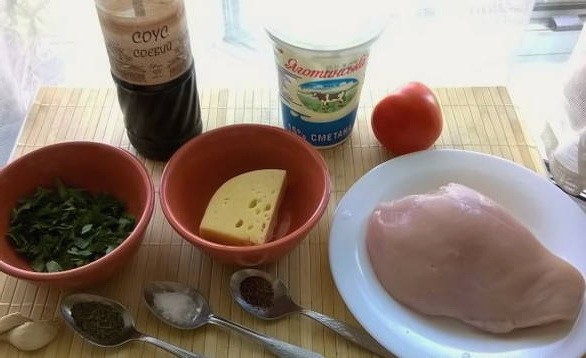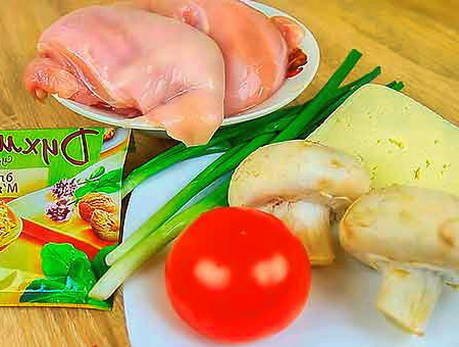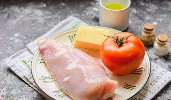 Met een minimale set producten, bijvoorbeeld kipfilet, kaas en tomaten, kun je een licht, geurig en waanzinnig lekker diner bereiden. Bovendien heeft de kip geen lange hittebehandeling nodig, waardoor het koken in de tijd aanzienlijk wordt verminderd.