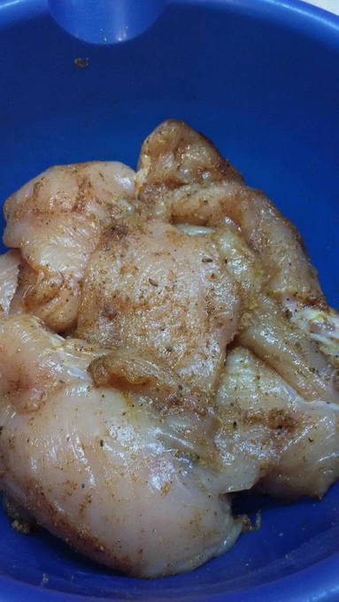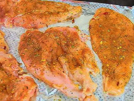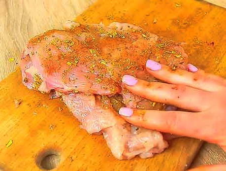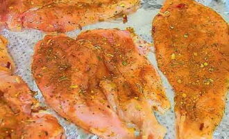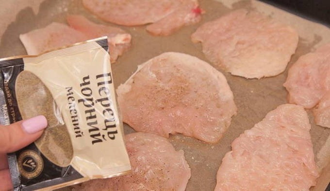 - Kruid de gevogeltekoteletten, voeg zout naar smaak toe en verwarm de oven voor op 180 graden.