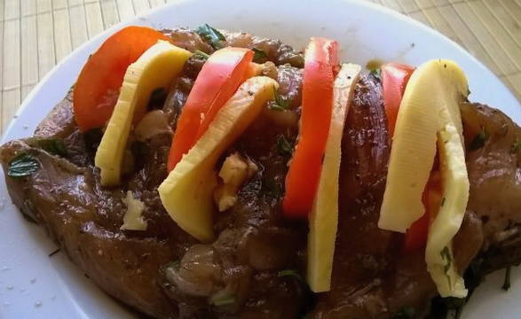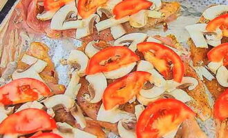 - Leg op elk stuk vlees eerst de gebakken uien in lagen, dan de tomaten en kaas. We bakken 35-40 minuten op een temperatuur van 180-190 graden.