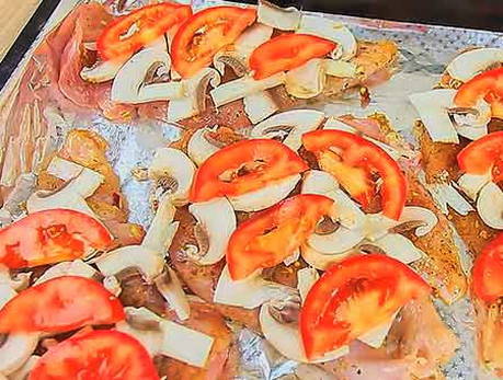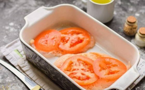 - Leg de gekruide kip in een ovenschaal of bakplaat en leg de in ringetjes gesneden tomaat erop.
