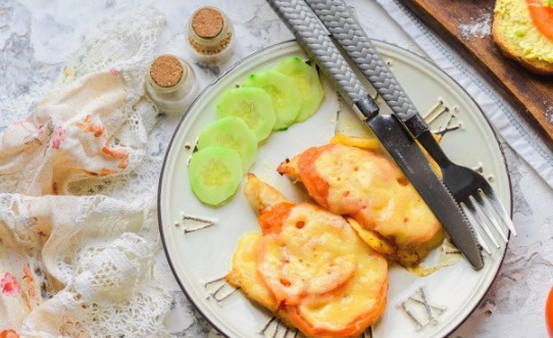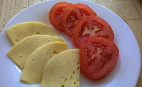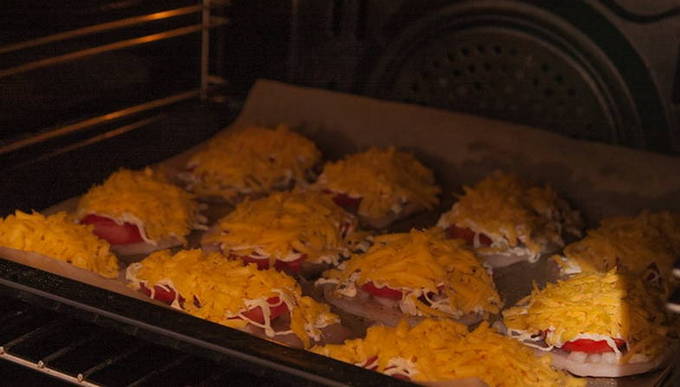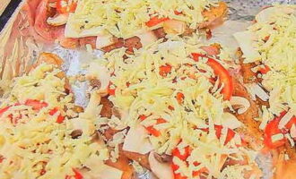 - Op een plakje tomaten - leg kaas, in dunne plakjes gesneden of geraspt. We bakken ongeveer een half uur op een temperatuur van 180 graden.