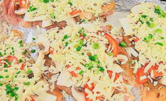 Leg op elk stuk halve ringen tomaten, champignons en voeg licht zout toe.