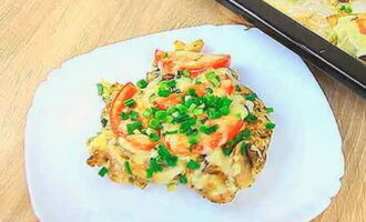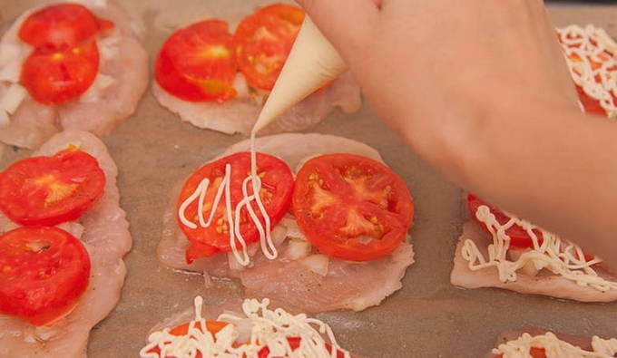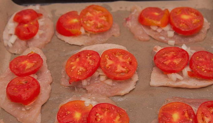 Een gerecht dat ideaal is voor zowel een feestelijke tafel als een familiediner - kipfilet a la "Frans vlees", gebakken in de oven met een smakelijk korstje van kaas, tomaten en uien.