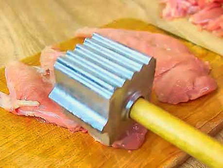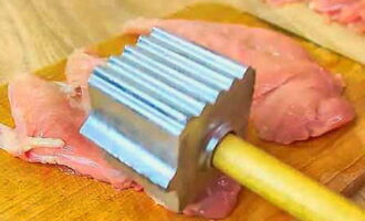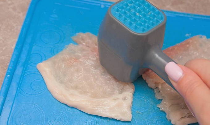 - Klop de resulterende plakjes voorzichtig met een keukenhamer en leg ze op een bakplaat of in een ovenschaal (voorheen ingevet met zonnebloemolie).