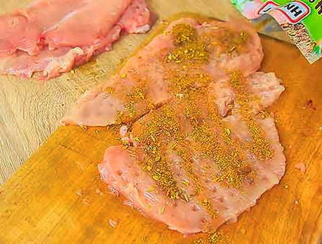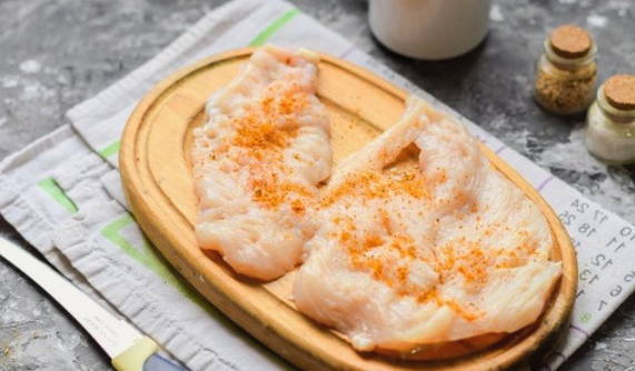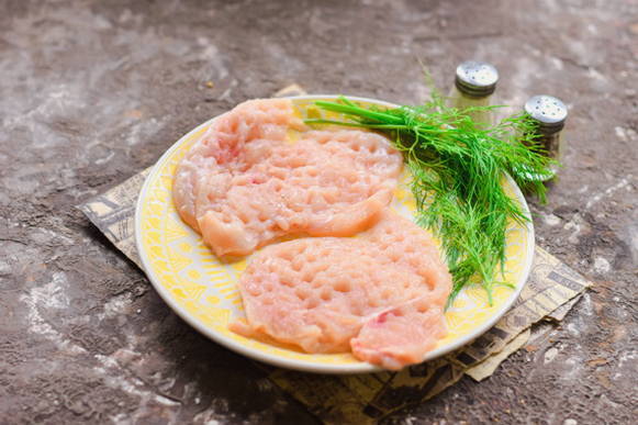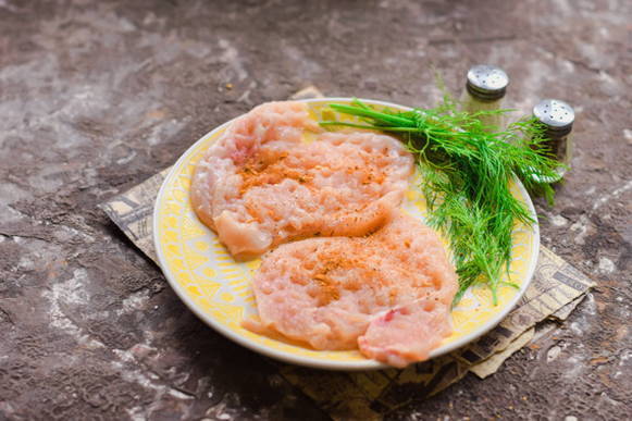 - Snijd de filet in de lengte in gelijke borden en klop lichtjes los. Bestrooi elk stuk met kruiden en zout aan beide kanten.