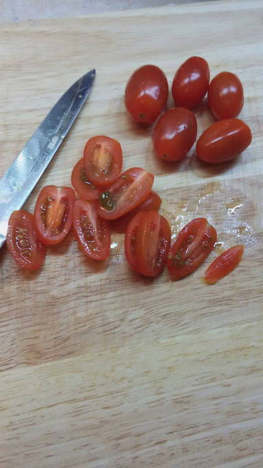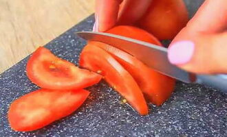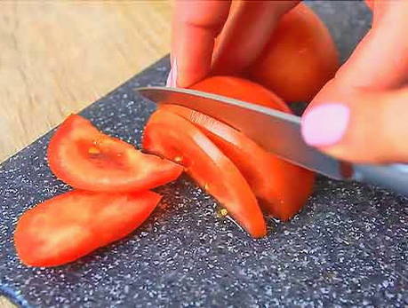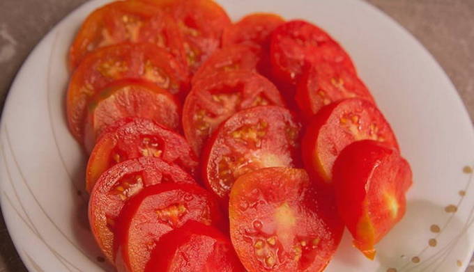 - Snijd rijpe tomaten in ringen van gemiddelde dikte.
