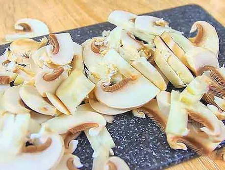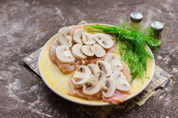 - Leg de in dunne borden gesneden champignons op het vlees.