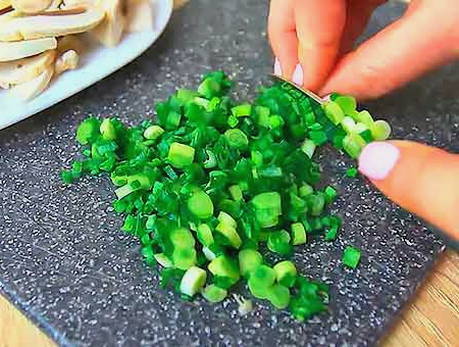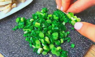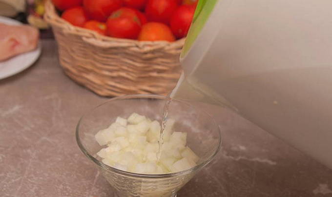 - Allereerst schillen we de uien van de schil, hakken ze fijn en vullen ze met kokend water om overtollige bitterheid te neutraliseren.