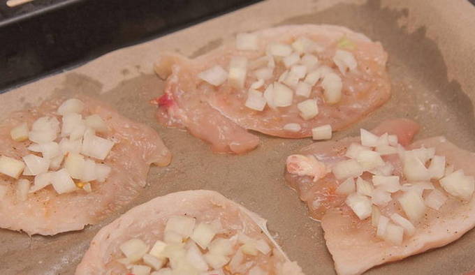 - Terwijl de kip marineert, bereiden we de rest van de producten: bak de fijngesnipperde ui goudbruin, snijd de tomaten in cirkels (als de kers doormidden is), rasp de kaas.
