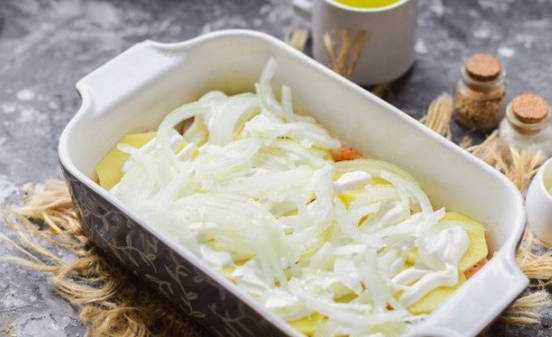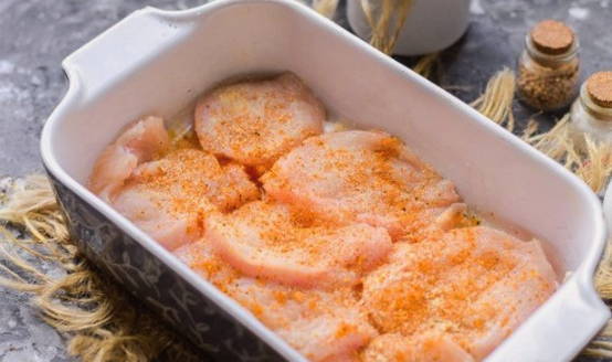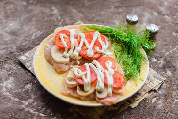 - Snijd de filet in dunne platen, breng over naar een diepe bak en begin te marineren: zout, kruiden en mayonaise. Roer goed, dek af met een bord en zet onderdrukking voor snellere impregnatie.