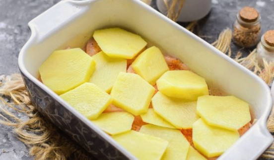 - Schil de aardappelen, snijd ze in cirkels en verdeel ze in een gelijkmatige laag over het gevogelte.
