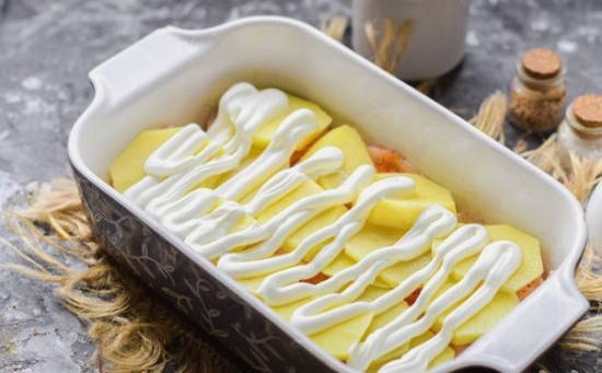 - De resulterende "constructie" van verschillende componenten wordt rijkelijk overgoten met mayonaise om een meer delicate en romige smaak te geven.