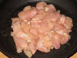 - Snijd de filet in een kleine kubus en marineer met een mengsel van knoflook, door een pers gehaald, olie, zout en peper - meng en laat een half uur staan.