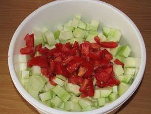 - We hakken ook de tomaten, voegen toe aan de courgetteblokjes, zout, peper en mengen goed.