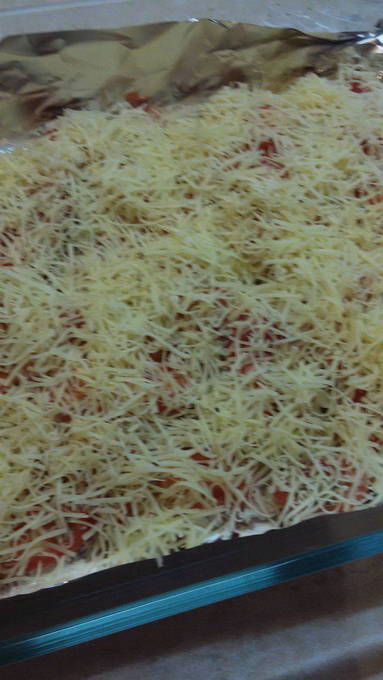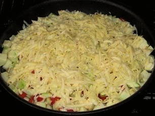 - Bestrooi het verzamelde gerecht royaal met geraspte kaas en stuur het naar de oven. We bakken 30-45 minuten op 180 graden.