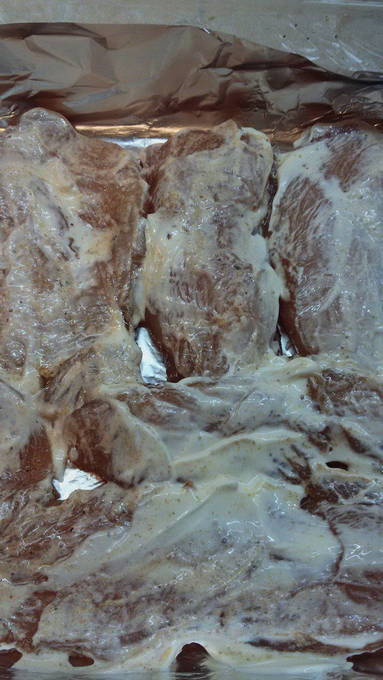 - Smeer op elke plak vlees een kleine hoeveelheid zachte kwark (kan worden vervangen door kwark) en smeer dit uit.