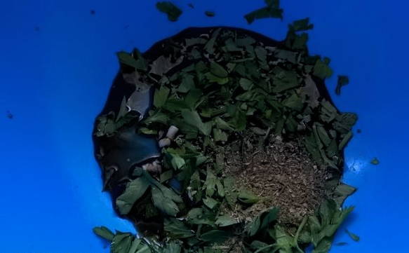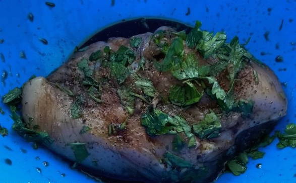 - Meng voor de marinade in een diepe kom gedroogde basilicum, sojasaus, knoflook (door een pers of breker) en een paar takjes gehakte peterselie.