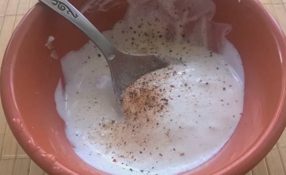 - Om ervoor te zorgen dat het vlees na de warmtebehandeling sappig blijft, bereiden we een vulling van zure room en een geraspte knoflookteen.