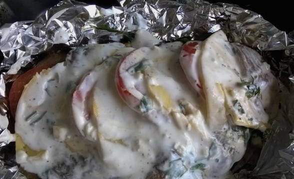- Smeer de kip in met zure room en knoflooksaus. We vormen een "boot" van de folie en sturen de borst om er 30 minuten in te bakken op een temperatuur van 180 graden.