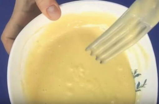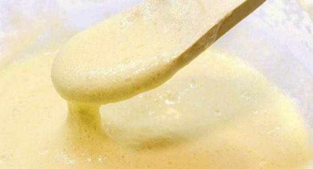 - Het mengsel moet homogeen en glad zijn en qua consistentie op dikke zure room lijken. Bedek het afgewerkte beslag met een deksel of huishoudfolie en stuur het een half uur naar de koelkast. Er wordt aangenomen dat het ideale beslag precies koud moet zijn.