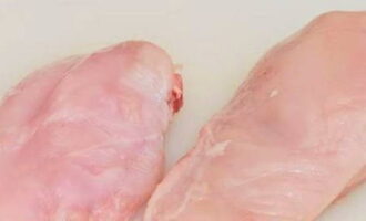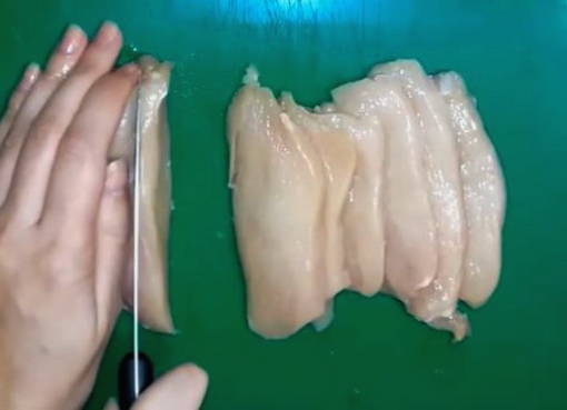 - Laten we beginnen met kipfilet. Spoel het af en dep het droog met keukenpapier om overtollig vocht te verwijderen. Als filets met film en vet, verwijder ze dan. Snijd in stukjes van ongeveer 1 cm dik, de stukjes moeten dun genoeg zijn, want we slaan ze er niet af.