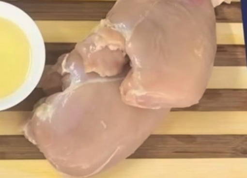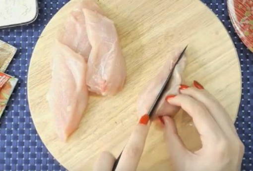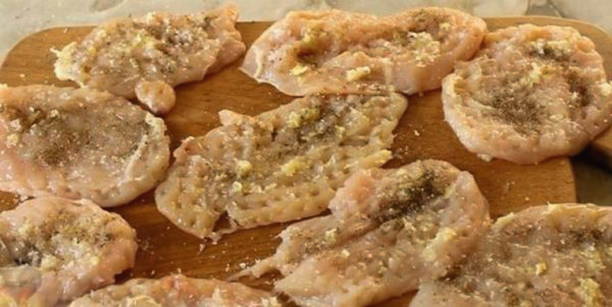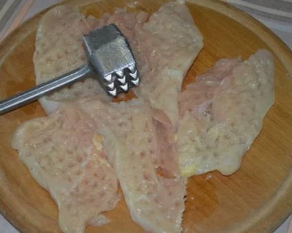 - Snijd de voorbereide filet in platen van 1,5 cm en sla ze met een speciale hamer. Doe dit zo voorzichtig mogelijk door de kipfilet voor het kloppen in een plastic zak te doen en af te dekken met huishoudfolie. Kruid de filet naar eigen smaak met een beetje zout.