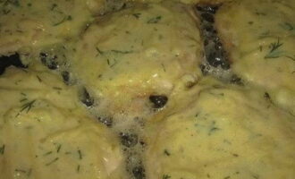 - Leg in een goed verwarmde koekenpan met plantaardige olie de kipfilet met beslag. Bedek de karbonade vervolgens met een dikke laag beslag.