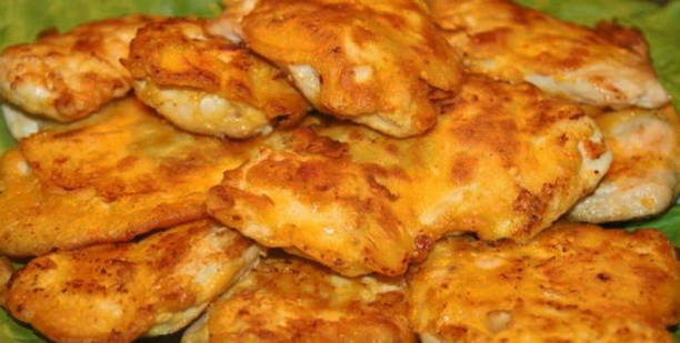 - Nadat je de afgewerkte portie op een bord hebt verwijderd, doe je de tweede. Voordat je de volgende stukjes kippenvlees in het beslag dompelt, meng je het goed, want het zetmeel zakt heel snel naar de bodem. Doe dan alles naar analogie met de eerste schade.
