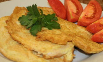 - Nadat je de afgewerkte filet uit de pan hebt gehaald, leg je hem op keukenpapier of dikke servetten. Hiermee wordt overtollige plantaardige olie verwijderd. Deze geurige kipfilet met beslag is een aanvulling op elk bijgerecht dat je kookt.