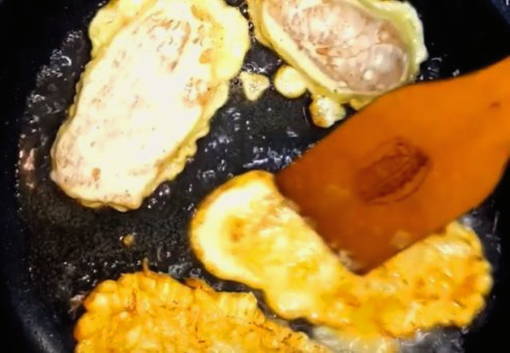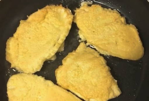 - Als de kipfilet is losgeklopt en het beslag klaar is, kun je het frituurproces starten. Om dit te doen, hebben we een goed verwarmde koekenpan met plantaardige olie nodig. Karbonades in ei- en bloembeslag kunnen het beste op middelhoog vuur worden gebakken. Dompel elk stuk filet in beslag en leg het meteen in de pan. Bak aan beide kanten 3 minuten. Tijdens het frituren moet het beslag goudbruin worden.