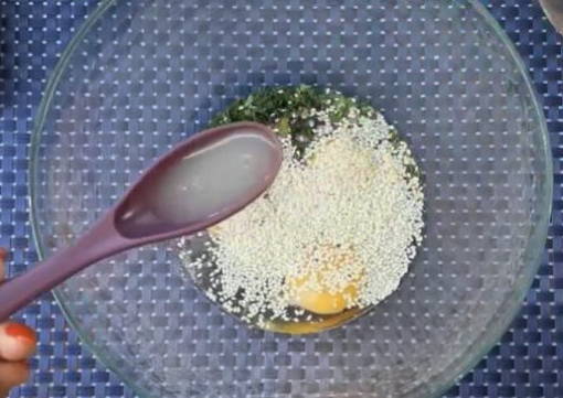 - Meng in een diepe kom eieren, gehakte kruiden, zwarte peper (gemalen), zout en sesamzaad. Knijp een eetlepel sap uit de citroen en stuur het daarheen. Roer alle ingrediënten tot ze gecombineerd zijn.