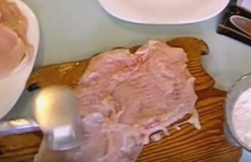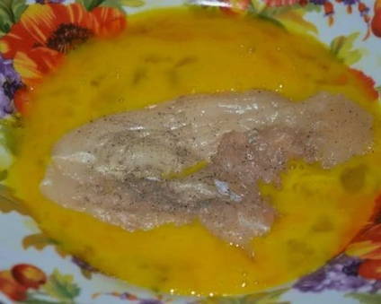 - Spoel de filets af. Dep droog met keukenpapier. Verwijder alle onnodige dingen. Neem het scherpste mes en snij in de dunst mogelijke platen. In dit recept moeten we niet alleen knapperigheid bereiken van het beslag, maar ook van het vlees zelf. Klop de kipfilet tot deze transparant is. Doe dit voorzichtig om de stukjes niet te breken. Bestrooi vervolgens naar smaak met zout en zwarte peper.