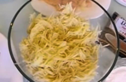- Was de aardappelen, schil ze en rasp ze fijn (u kunt een keukenmachine of een vleesmolen met groentehulpstuk gebruiken). Voor de bereiding van aardappelbeslag is het beter geen jonge aardappelen te gebruiken, aangezien deze nog niet zetmeelrijk genoeg zijn en niet de nodige hechting zullen geven. Als de aardappelen bij het wrijven veel sap binnenkrijgen, giet het dan af.